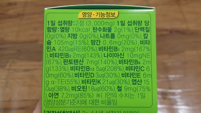 1일 섭취량은3,000mg 2정으로 1일 섭취량 당 함양은 열량 10kcal라고 해요.