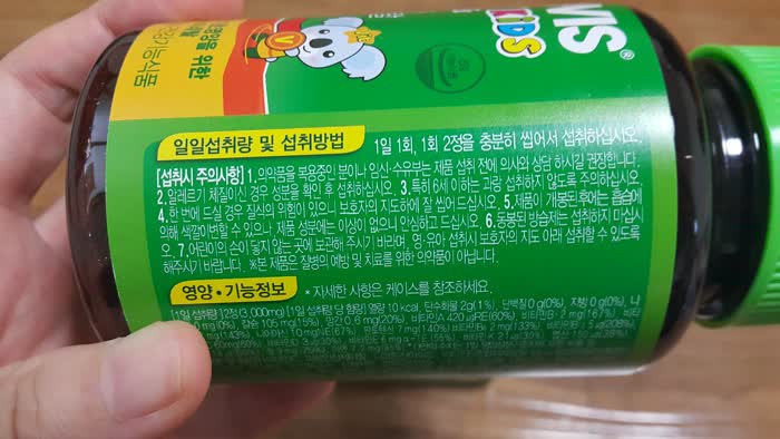 '6세 이하는 과량 섭취하지 않도록 주의해주세요'라는 문구가 보이네요. 아마 영양제가 맛있나 봐요. 어린 아이들이 더 먹으려고 하는 것을 보면요.