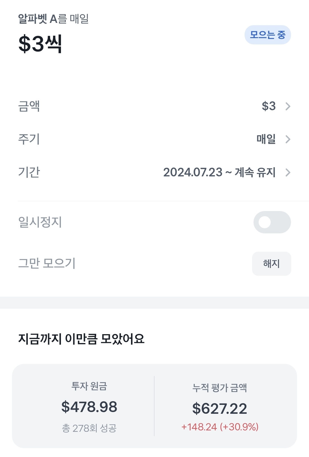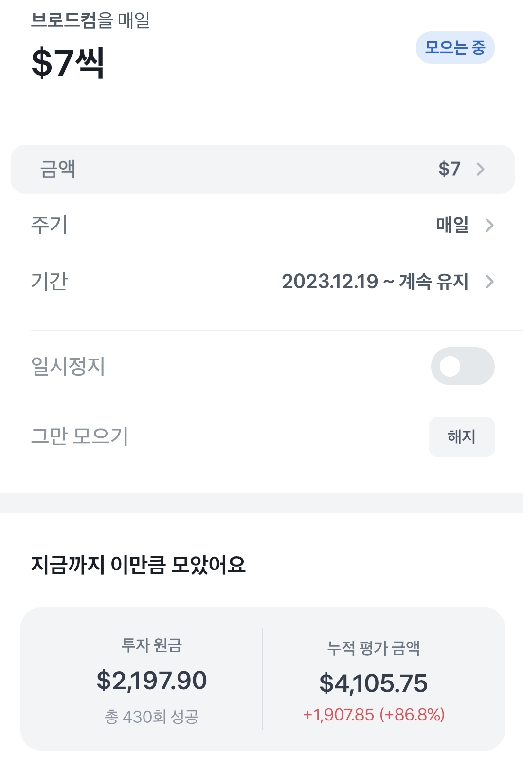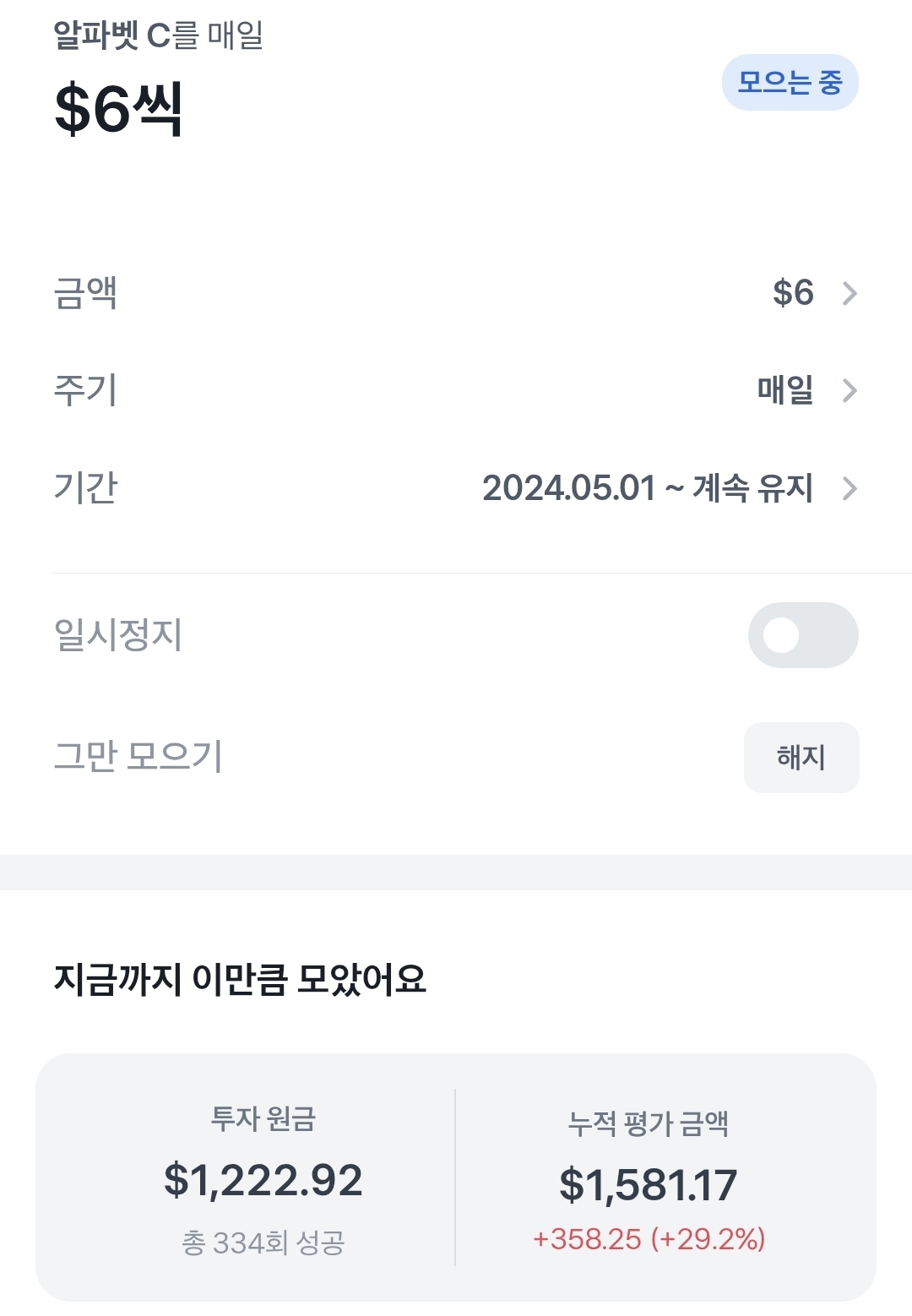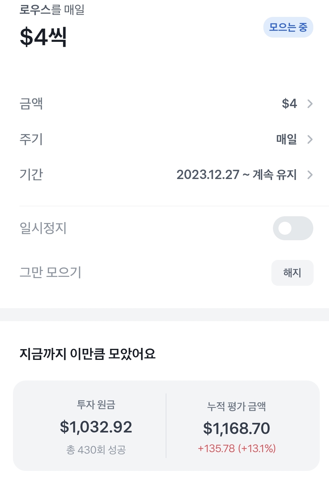 그리고 여태까지 투자한 금액에서 1달러를 추가합니다. 이 루틴대로 최대 50달러까지는 해보려고 합니다.