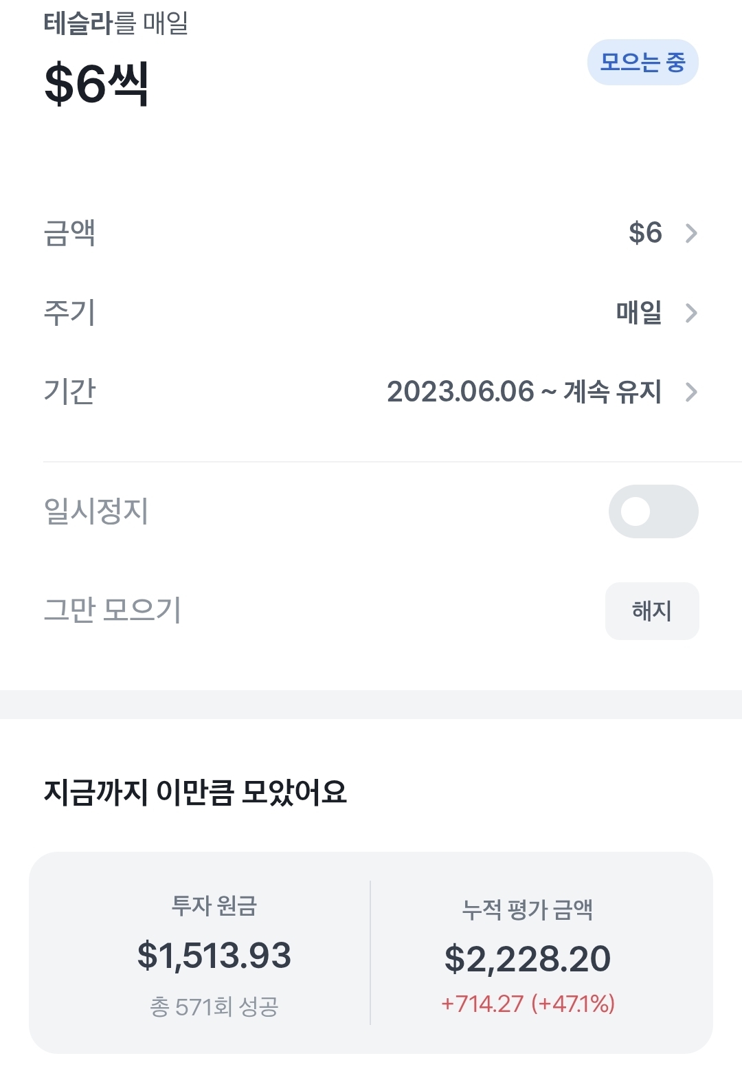 저에게 있어서 테슬라는 효자종목입니다. 처음 해외주식 양도소득세를 내게 한 것도 테슬라였습니다. 테슬라를 소수점으로 매일 6달러씩 투자하고 10% 수익이 나오면 모두 매도하고 있습니다. 테슬라 주식을 매일 100달러까지 투자할 수 있었으면 좋겠습니다.
