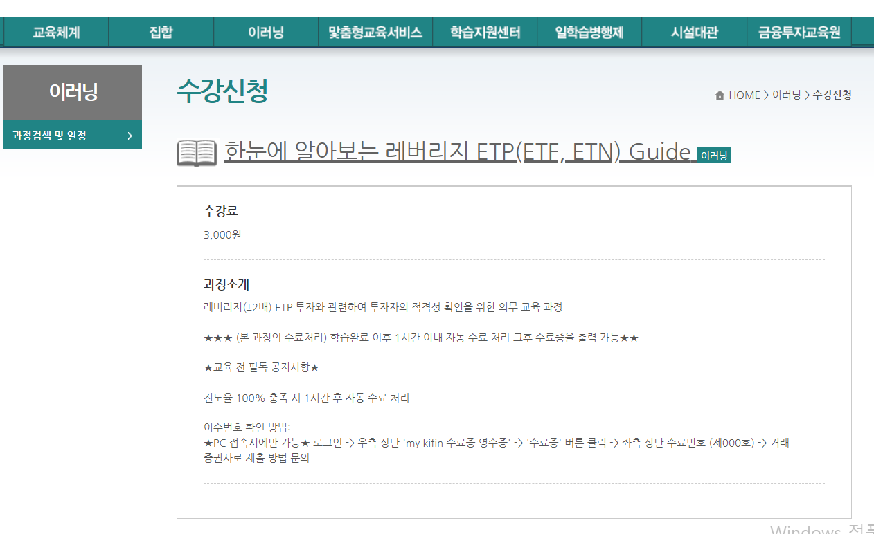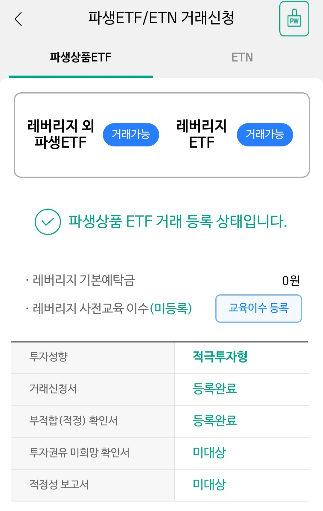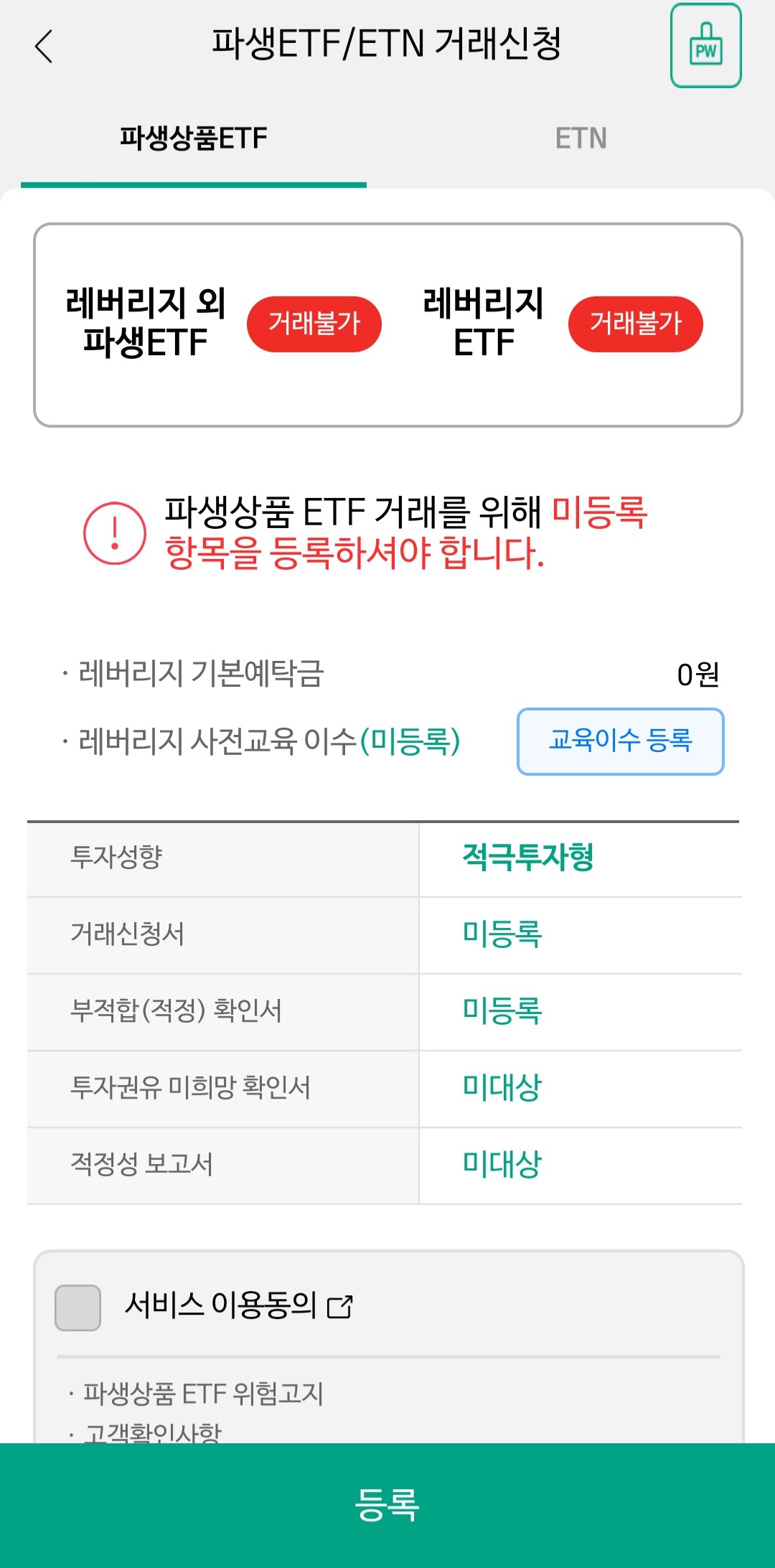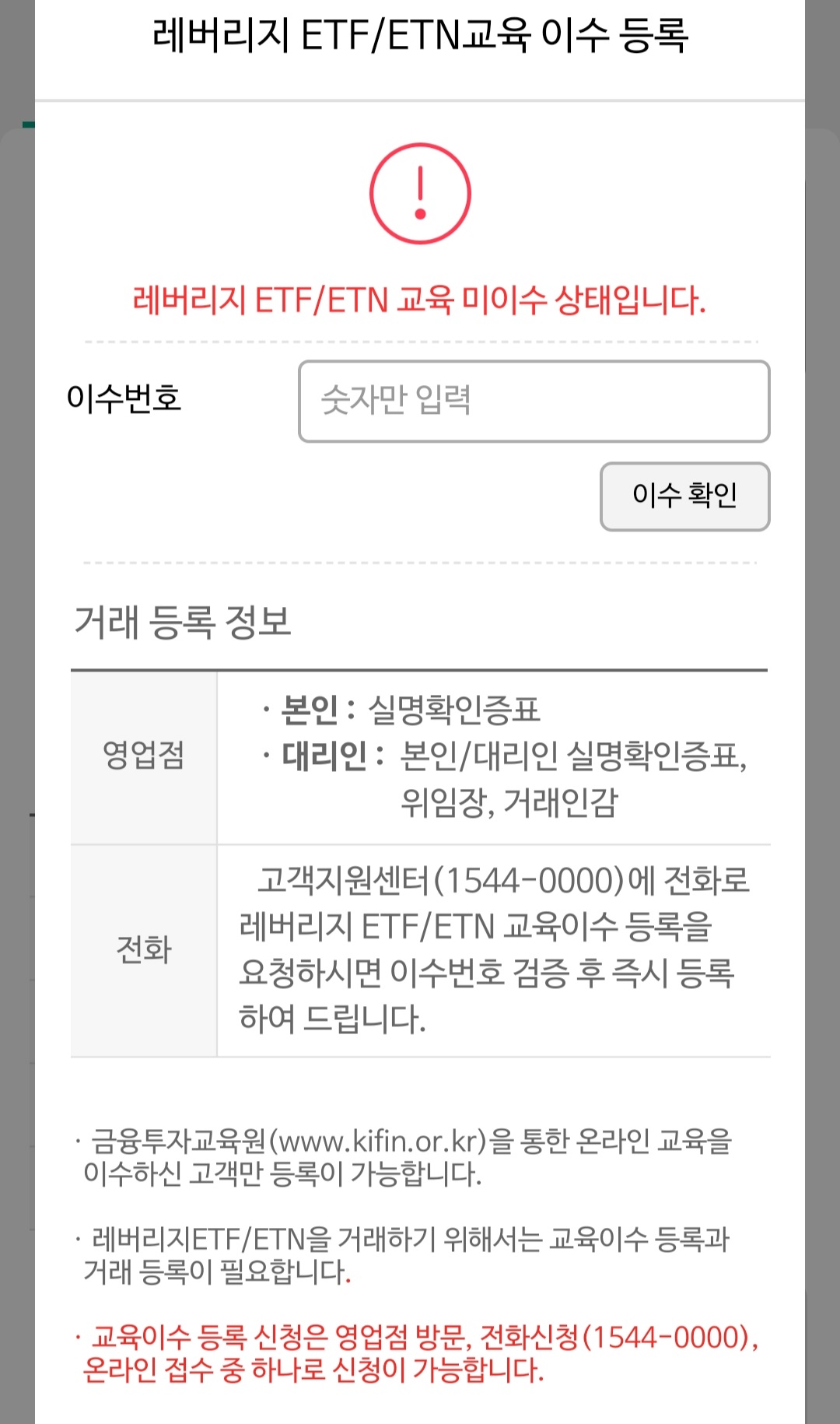 레버리지ETF/ETN을 거래하기 위해서는 교육이수 등록과 거래 등록이 필요하다고 해요.