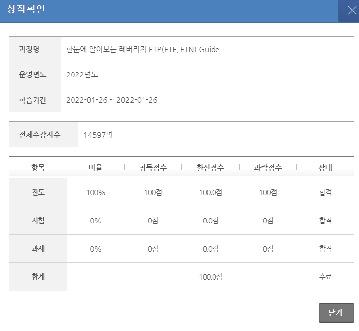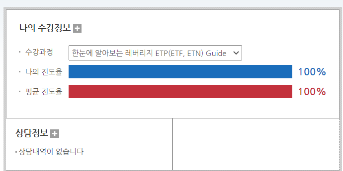 연금저축펀드에서 파생상품ETF 거래신청을 위해 레버리지 ETF/ETN 교육이수하기 개인기록이랍니다.