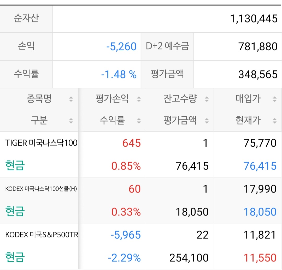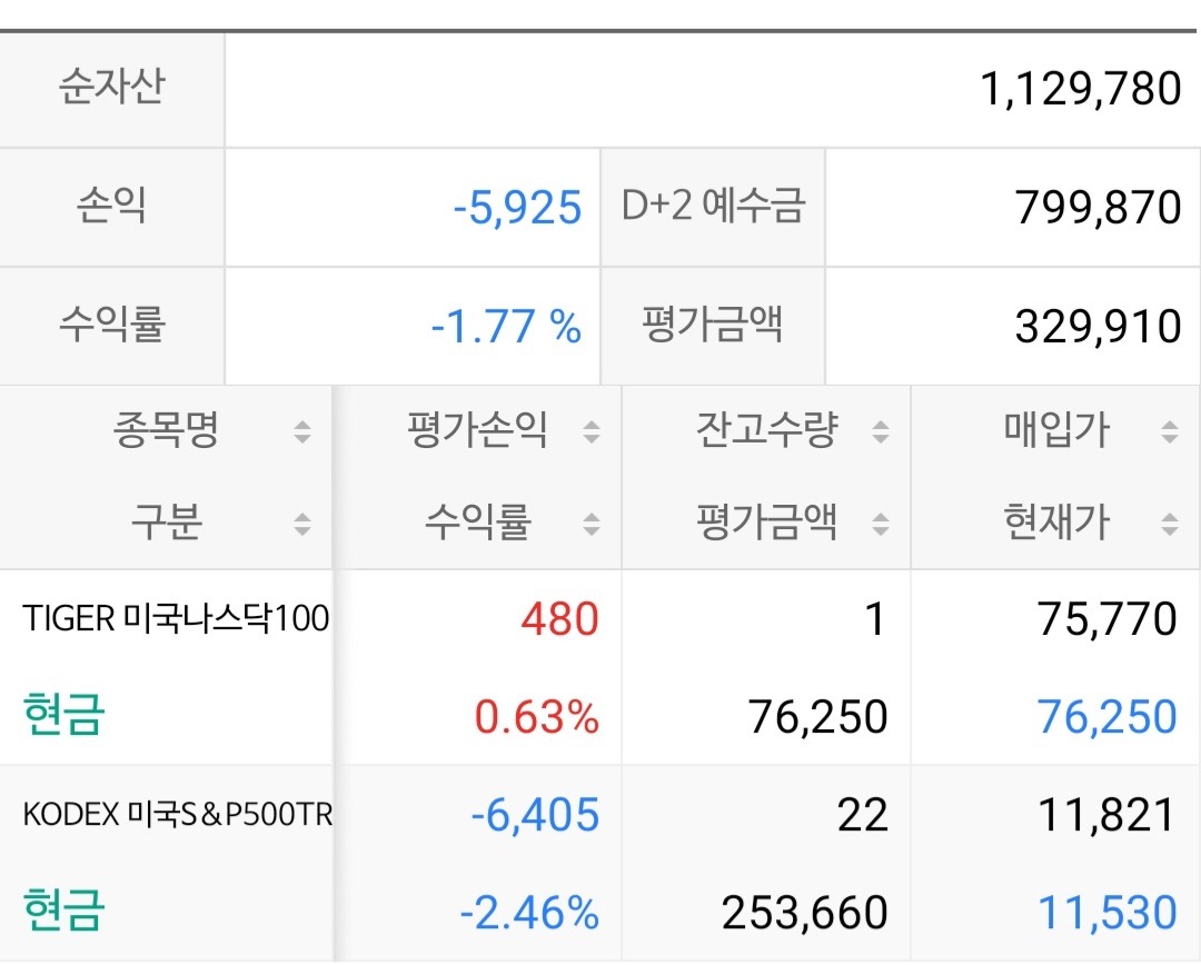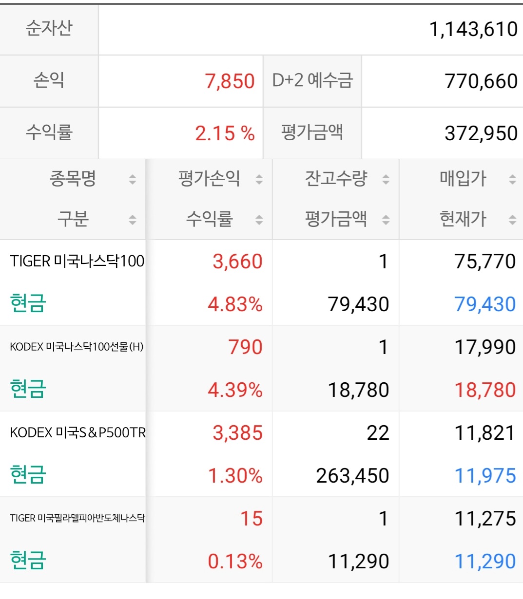 제가 넣은 것은 TIGER 미국나스닥100, KODEX 미국S&P500TR이예요.