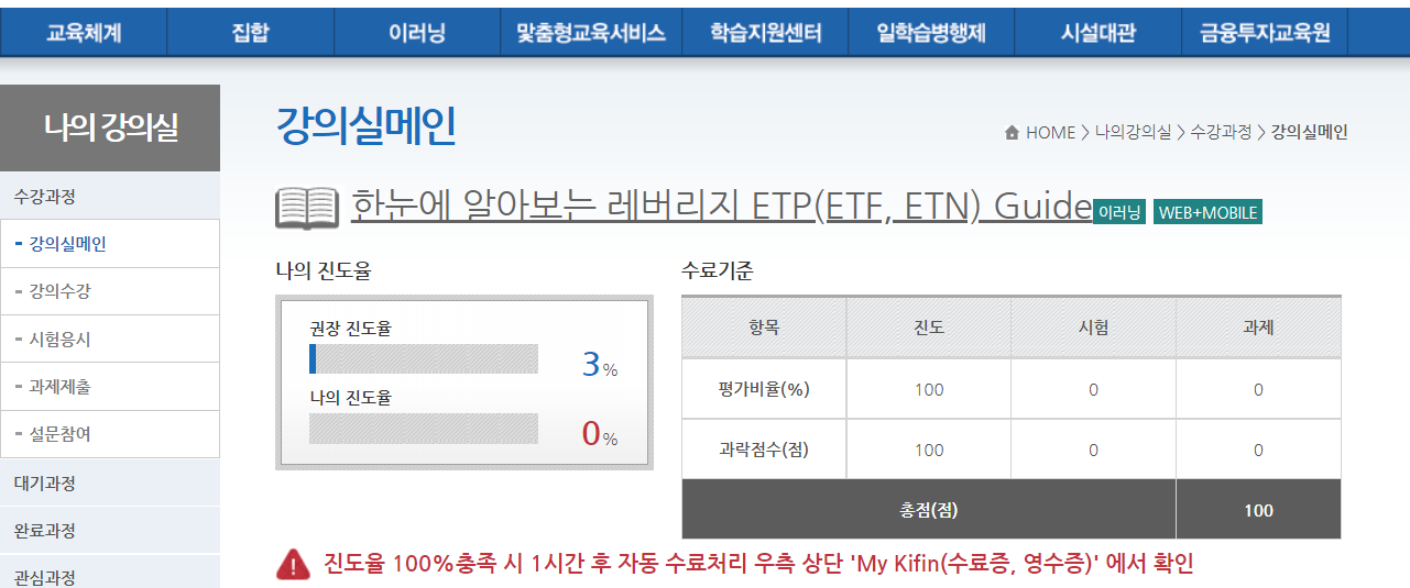 - 특징: 진도율 100% 충족시 1시간 후 자동 수료 처리, 학습완료 이후 1시간 이내 자동 수료 처리 그후 수료증 출력 가능
