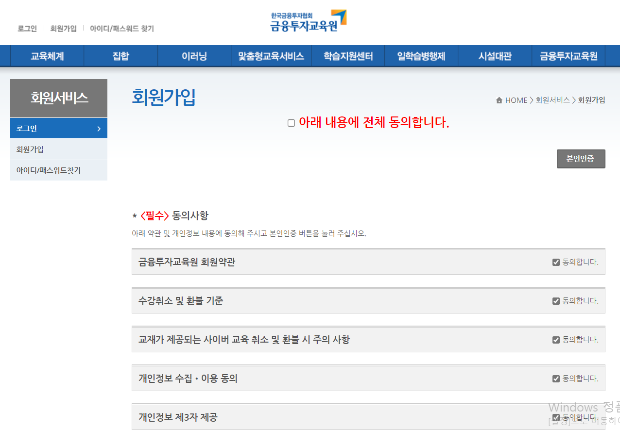 - 분홍색으로 된 사전교육을 받기 위해 회원가입부터 해야 해요.