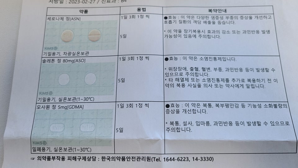 간호사 선생님께서 진통제 2개와 위장약 1개라고 말씀을 해주시네요.