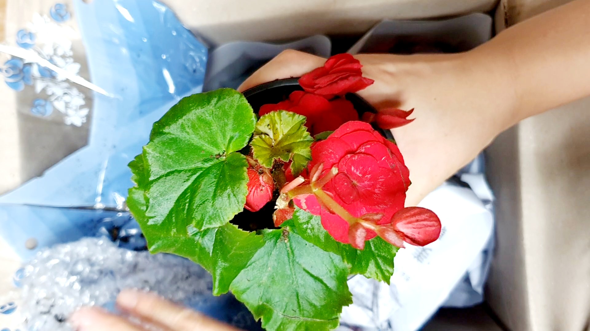 세 번째 장미베고니아 화분은 진한 빨간색이네요. 이 화분은 아쉽게 꽃이 떨어져 있네요. 택배로 오다 보니 이 부분은 어쩔 수 없나 봐요.
