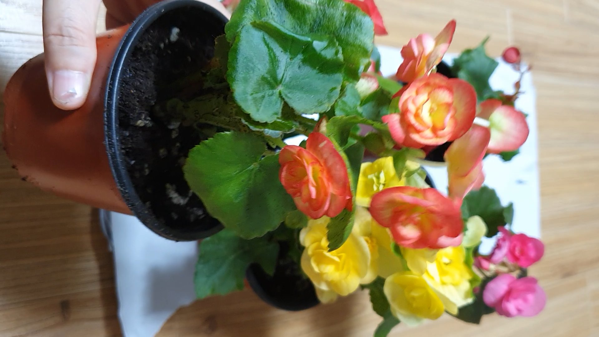 첫 번째 화분은 한 꽃 안에서 다양하게 예쁜 색을 뽐내고 있는 장미베고니아이네요. 보면 볼수록 색깔이 예쁘네요.