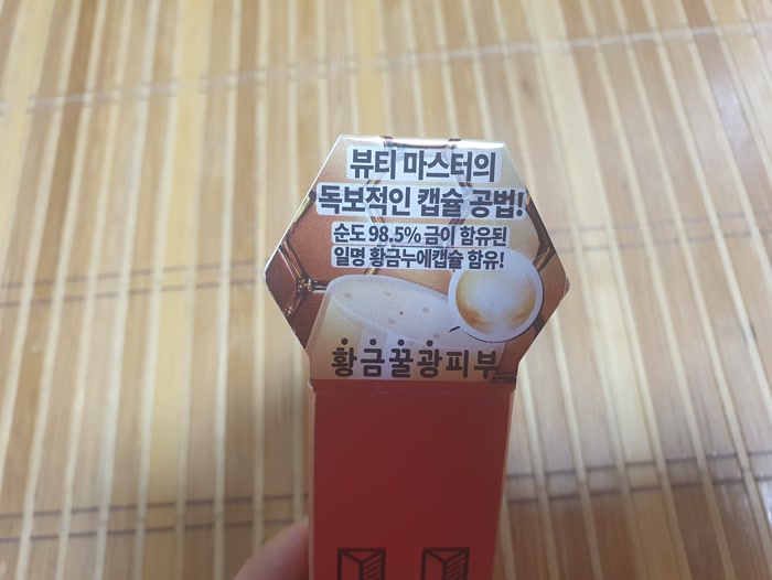 뷰티 마스터의 독보적인 캡슐 공법으로 순도 98.5% 금이 함유된 일명 황금누에캡슐을 함유해서 황금 꿀광피부를 만들어준다고 해요.