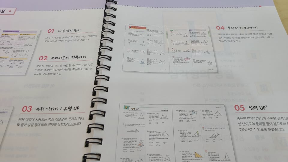 개념원리RPM은 개념 핵심 정리, 교과서문제 정복하기, 유형익히기, 중단원 마무리하기, 실력 UP으로 되어 있습니다.