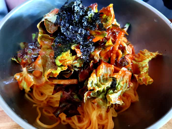 비빔국수가 나왔어요. 남편이 먹을 수 있게 비빔국수를 시켰거든요. 색깔이 너무 예쁘네요.