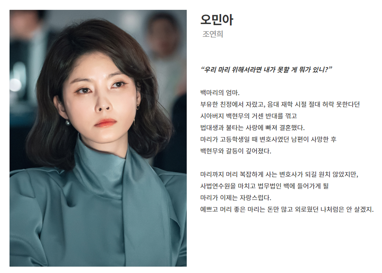오랜 시간 백혀무 대표를 보좌하며 그에 대한 충심이라고 겸손하게 핑계를 댔지만, 백현무 이후 법무법인 백을 이끌어 갈 사람은 바로 자신이라는 욕심이 있다.