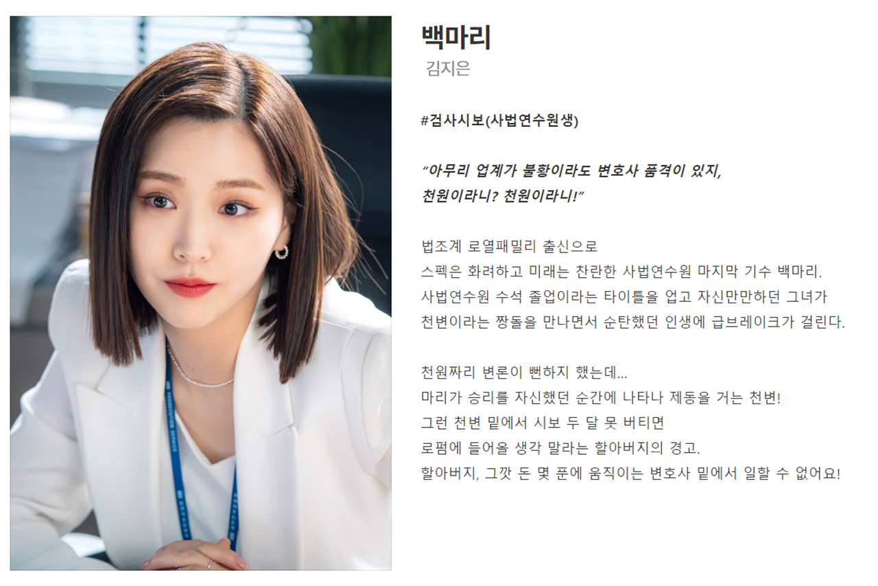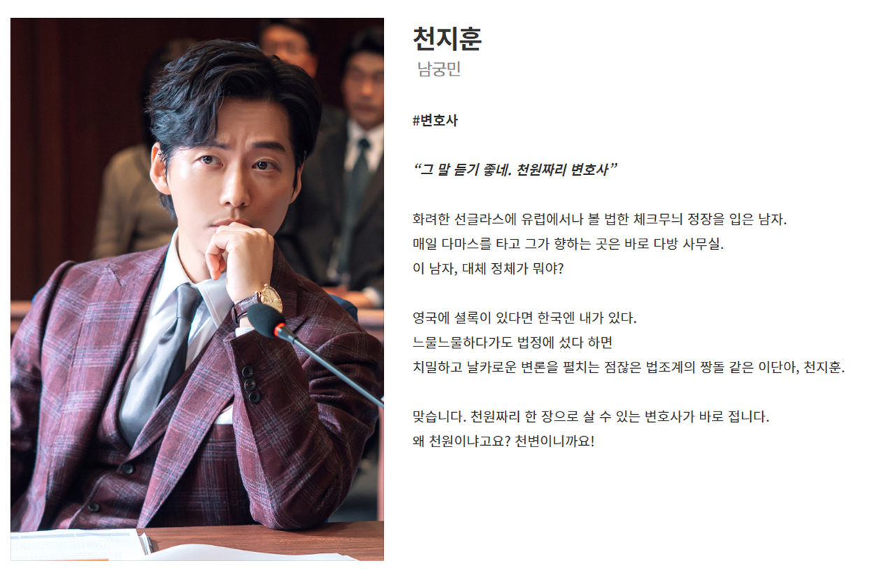 - 줄거리: 수임료는 단돈 천원 실력은 단연 최고, '갓성비 변호사' 천지훈이 빽 없는 의뢰인들의 가장 든든한 빽이 되어주는 통쾌한 변호 활극