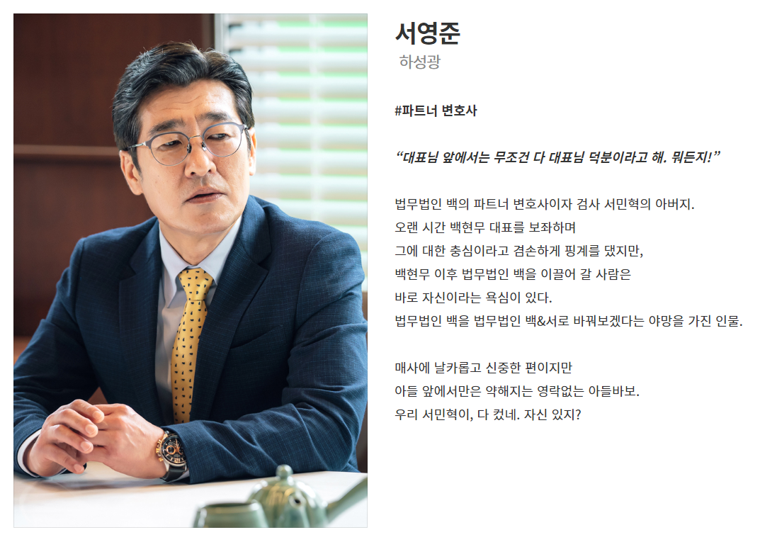 법무법인 백의 파트너 변호사이자 검사 서민혁의 아버지.