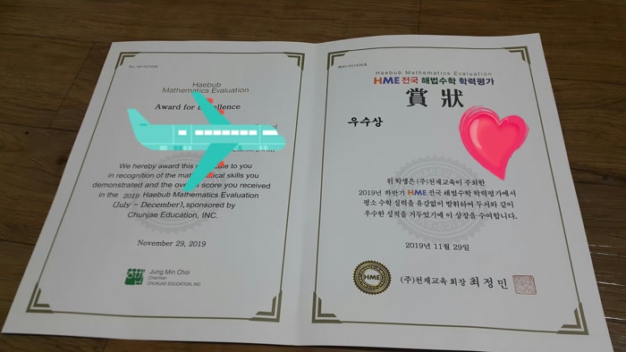 우리 열심히 해서 내년에는 HME 전국 해법수학 학력평가에서 둘 다 최우수상을 받자.