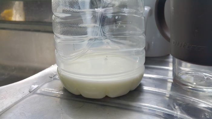 냉장고에 있는 우유를 빈 생수통에 담았어요.