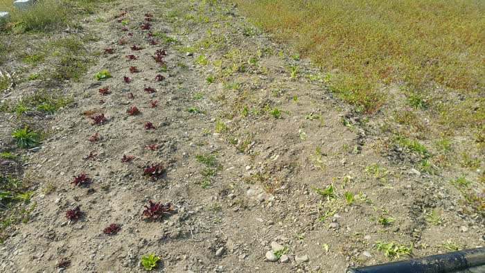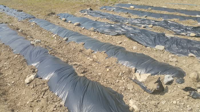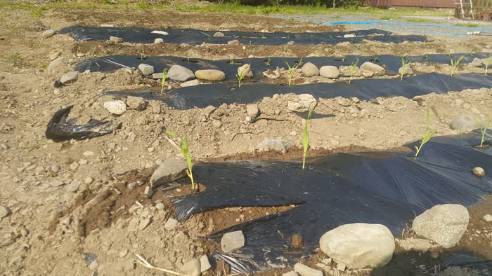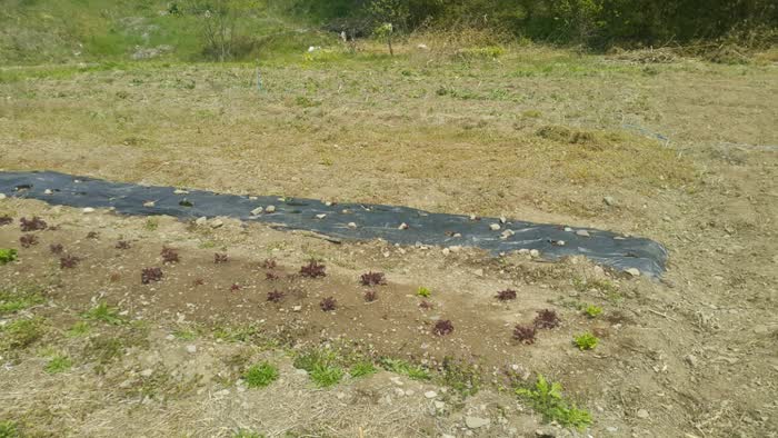 비닐멀칭을 했는데 강풍으로 비닐이 들려서 다시 흙과 돌을 올려주었어요. 무슨 봄바람이 이렇게 강한지.