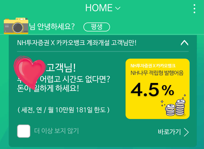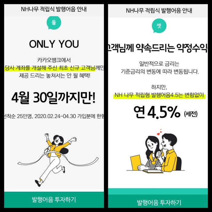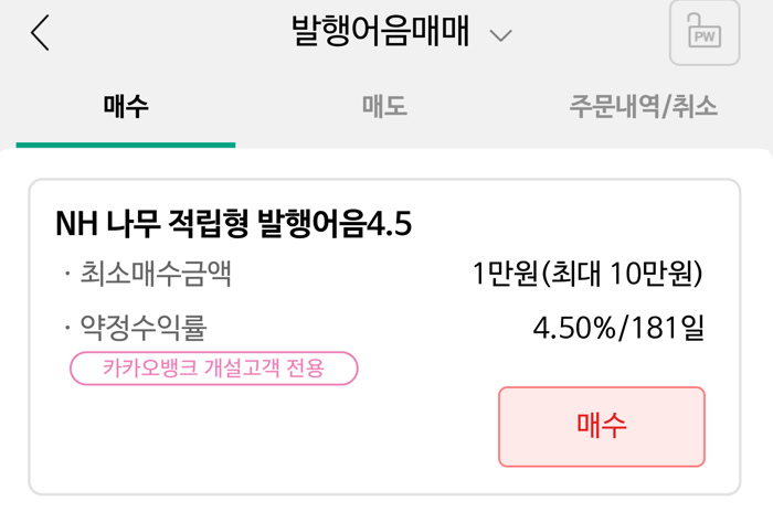 나무앱에서 나오려고 했는데 NH투자증권×카카오뱅크 계좌 개설 고객만 NH나무 적립형 발행어음을 가입할 수 있네요.