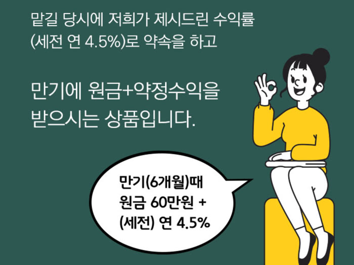 맡길 당시에 수익률(세전 연 4.5%)로 약속을 하고 만기에 원금+약정수익을 받게 되는 상품이라고 해요.