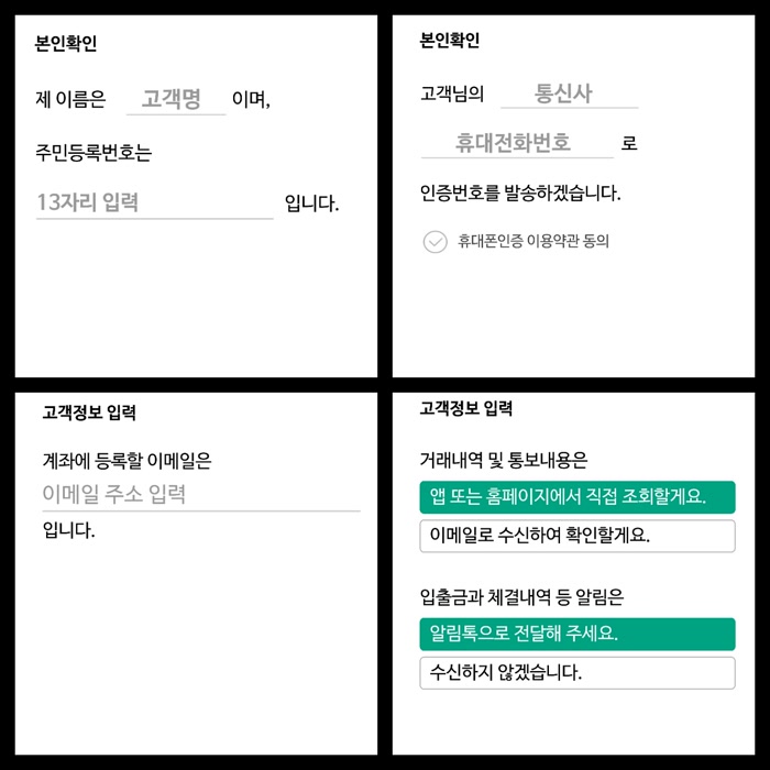 본인 확인을 위해서 이름, 주민등록번호, 통신사, 휴대전화번호, 인증번호, 이메일, 거래내역 및 통보내역, 입출금과 체결내역 등의 알림을 설정해 주면 되네요.
