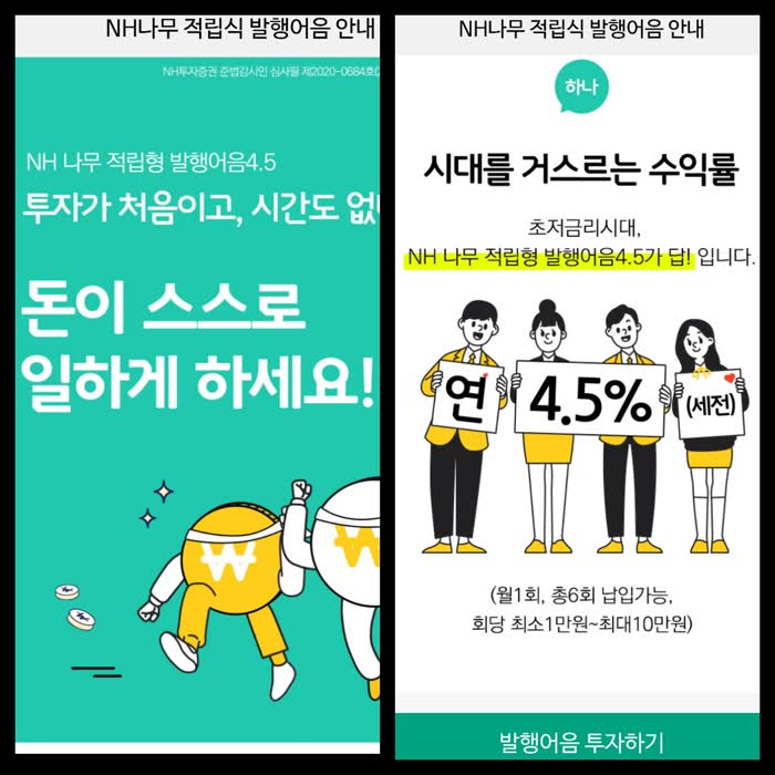 NH나무 적립식 발행어음은 4.5%의 수익률을 준다고 해요.