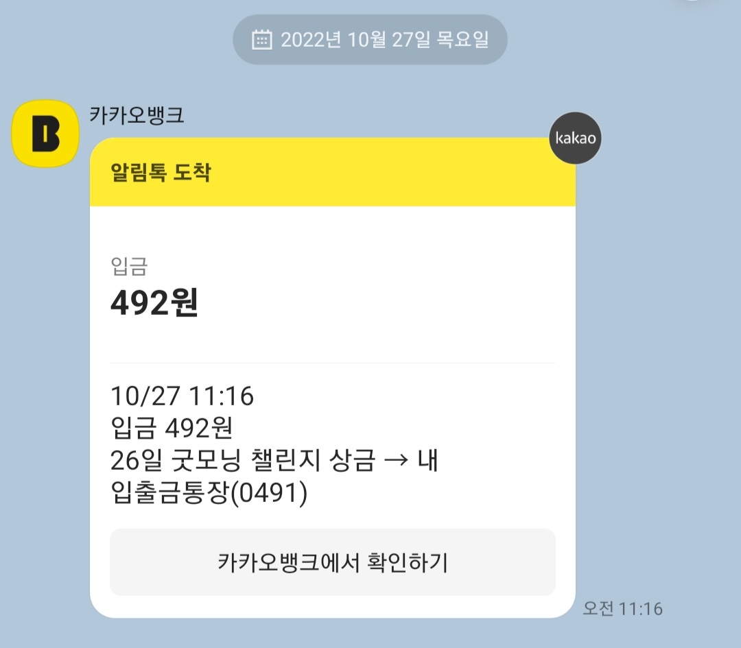 카카오뱅크 이벤트 26일 굿모닝 챌린지에 참여를 하고 있습니다.