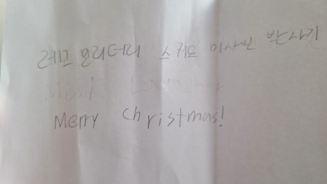 아들은 산타할어버지의 선물이라며 받고 싶은 선물을 적은 쪽지와 귤 2개, 제콕 2개를 놓아두었네요.