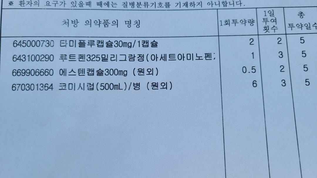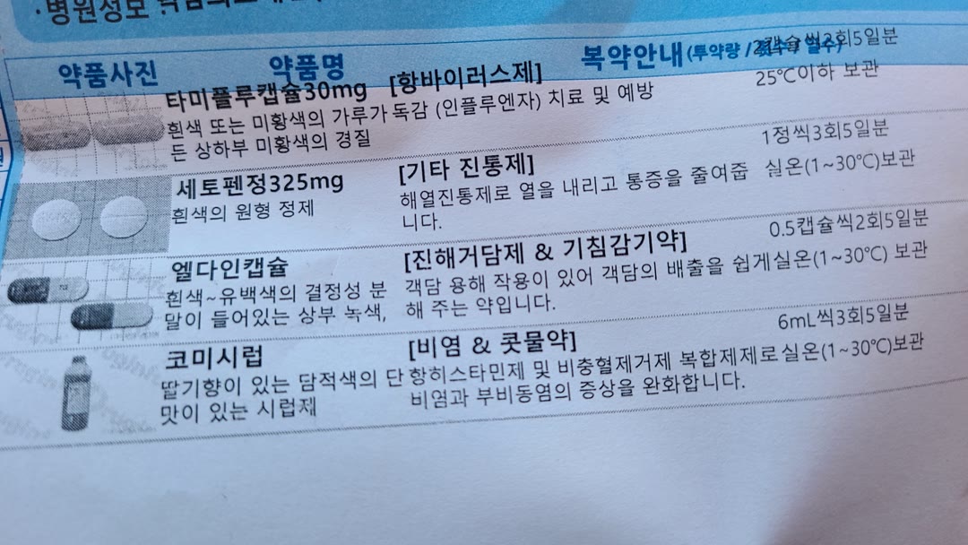처방전을 보니 타미플루가 있네요. 독감이 걸렸을 때 타미플루를 먹으면 많이 아프지 않다고 하던데.