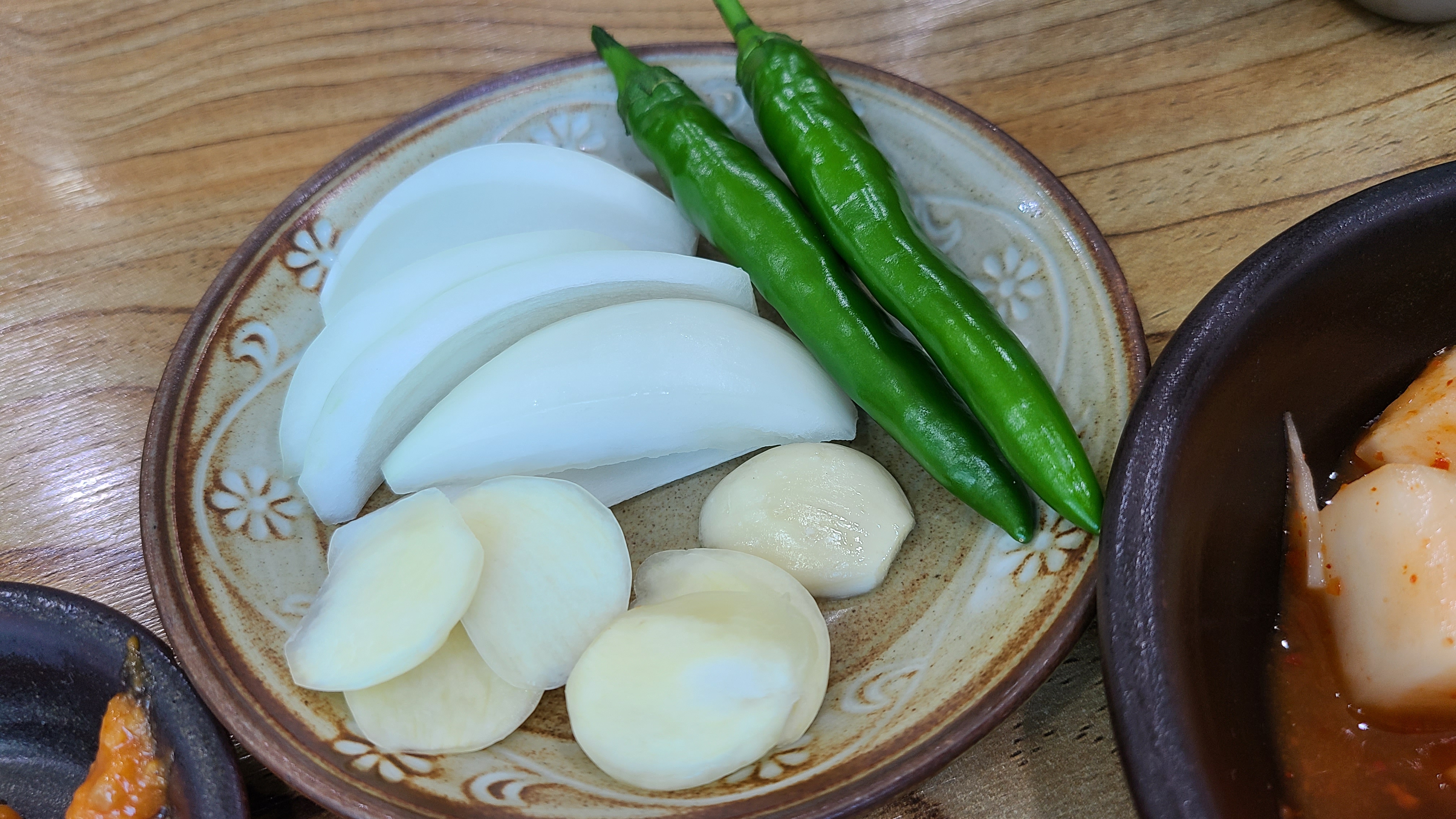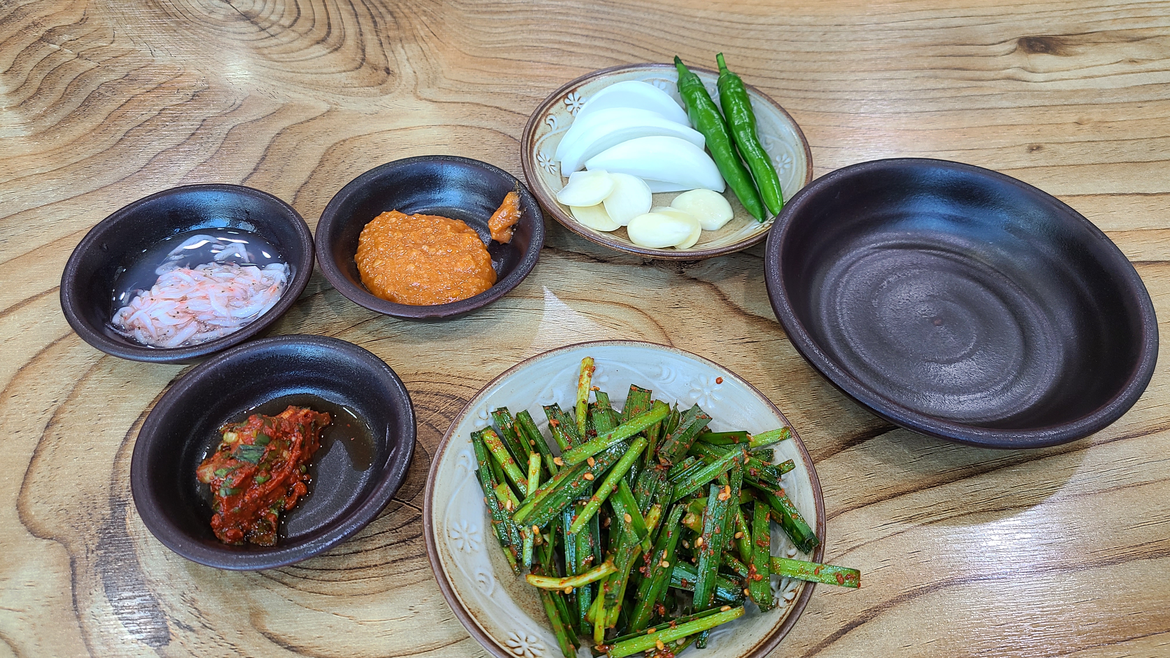 다대기, 새우젓, 부추무침, 고추, 양파, 마늘, 쌈장입니다.