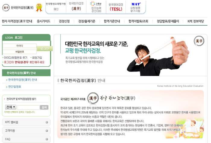 한국평생교육평가원(http://www.ikpe.or.kr/)에 들어가면 한국한자검증을 볼 수 있어요. 여기에서 한자자격시험을 응시할 수 있네요.