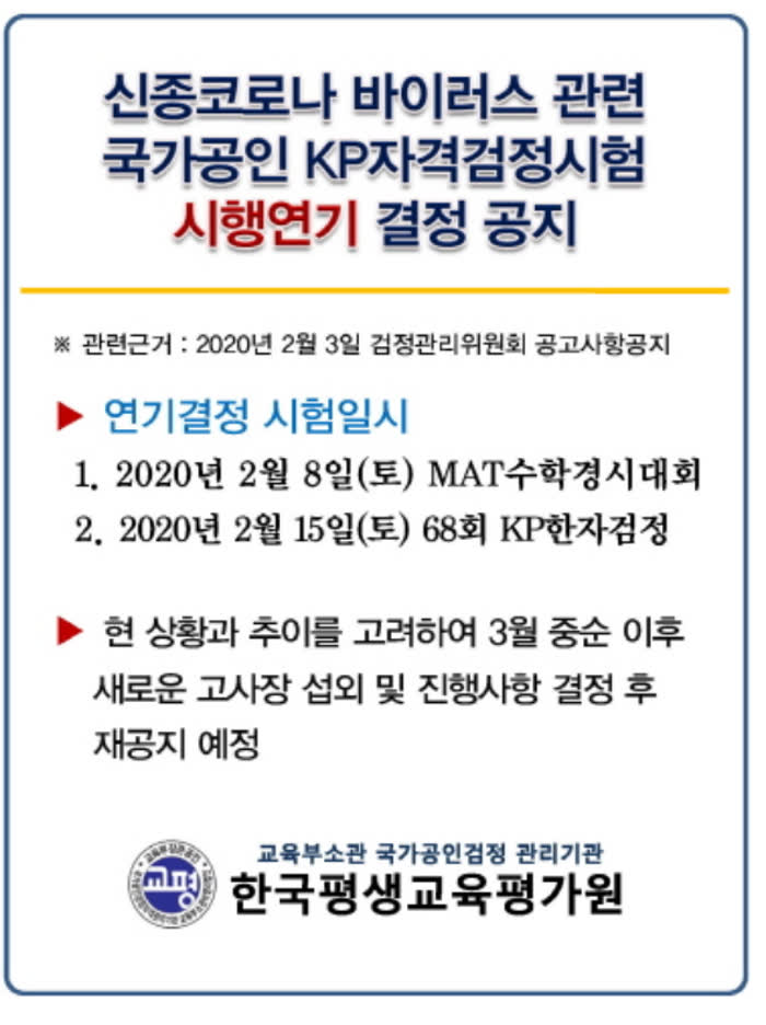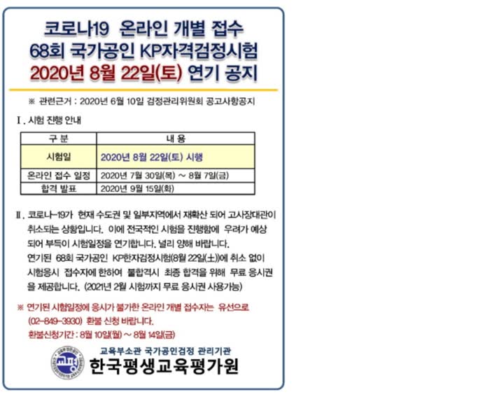 신종코로나 바이러스로 국가공인 KP자격검증시험은 시행연기가 되었어요.