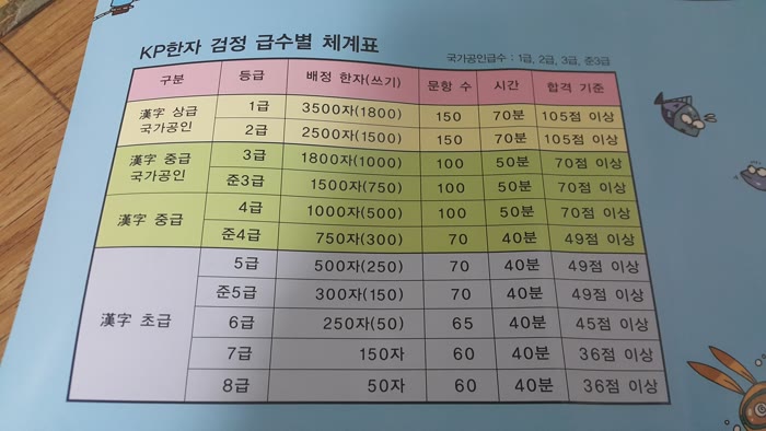 KP한자 검정급수별 체계표를 눈높이선생님께 받았어요. 급수별 문항수, 시간, 합격기준이 있네요.
