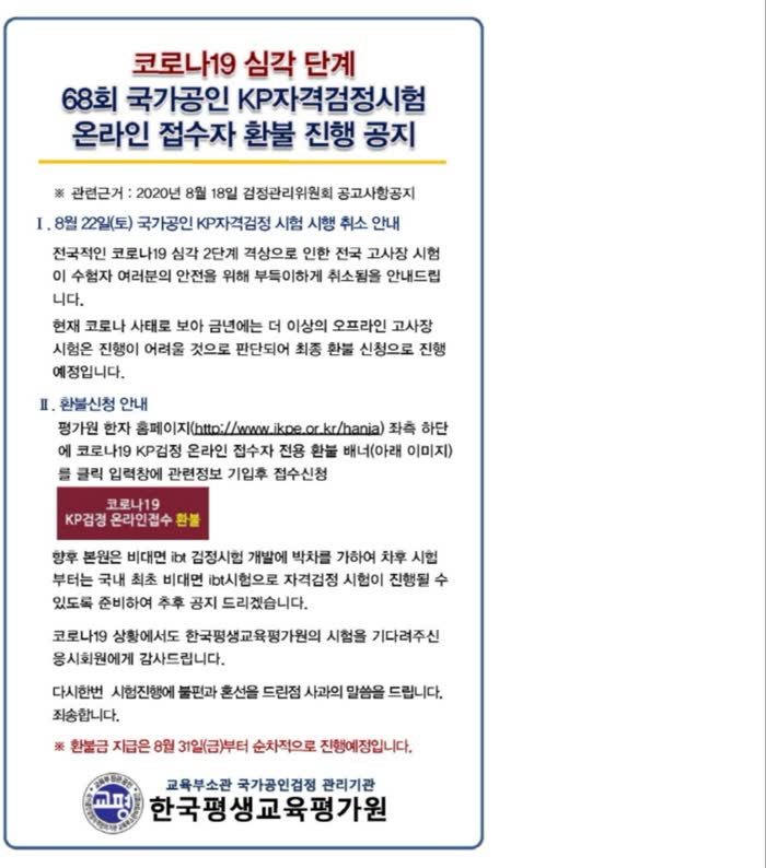 8월 22일 한자급수시험이 연기가 되고 올해는 더 이상의 오프라인 고사장 시험은 진행이 어려운 것으로 판단이 되어 최종 환불 신청을 받는다고 하네요.
