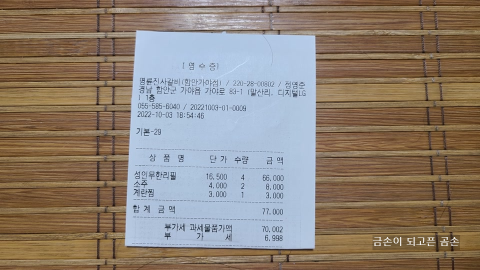 (무한리필 16,500원*4인, 소주 4,000원*2병, 계란찜 3,000원)