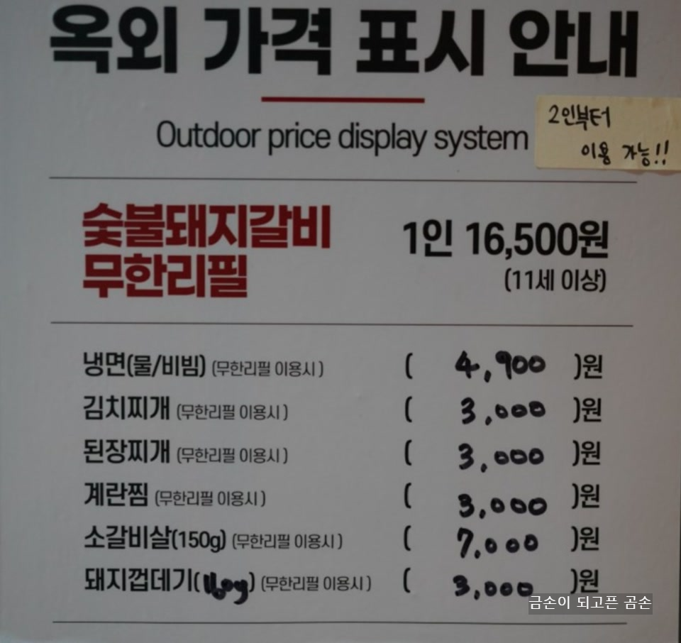 밥, 음료, 숯불돼지갈비, 셀프바는 무료이지만 그 외 메뉴는 가격을 지불해야합니다.