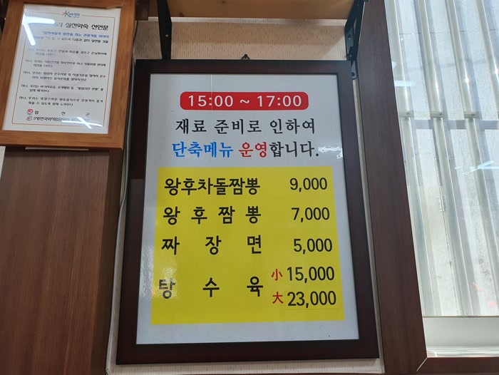 15~17시에는 재료 준비로 왕후차돌짬뽕, 왕후짬뽕, 짜장면, 탕수육으로 단축메뉴를 운영한다고 해요.
