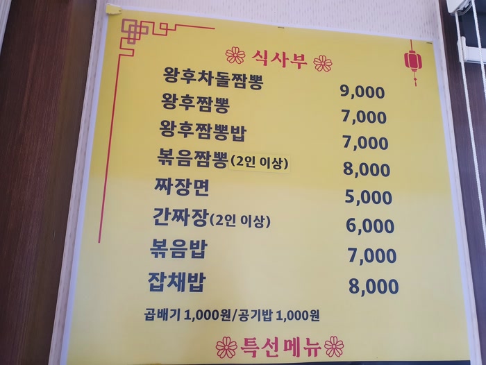 왕후차돌짬뽕이 9천 원, 잡채밥이 8천원, 짜장면이 5천 원이네요.