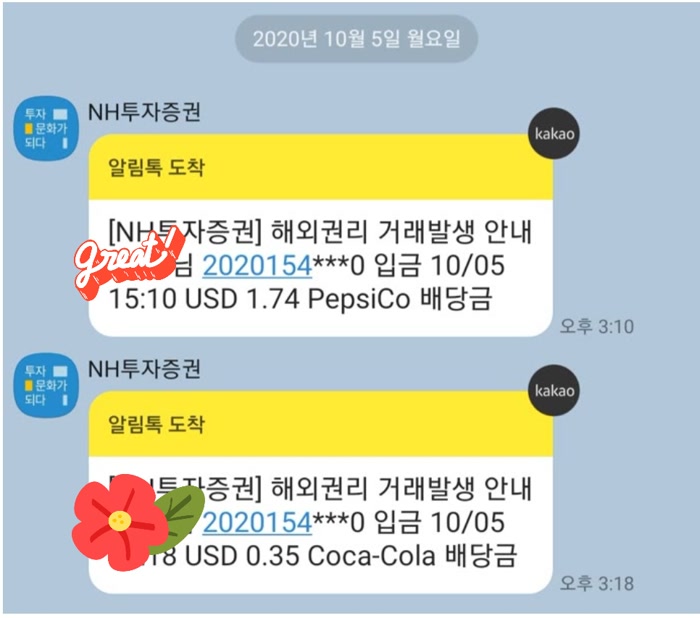 10월 5일 코카콜라 배당금 0.35달러가 입금이 되었어요. 코카콜라 주식은 펩시코 주식보다 싸서 부담 없이 살 수 있어요.