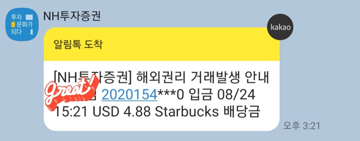 처음으로 스타벅스를 샀고, 5월 25일 스타벅스 배당금을 2.79달러를 받았어요.