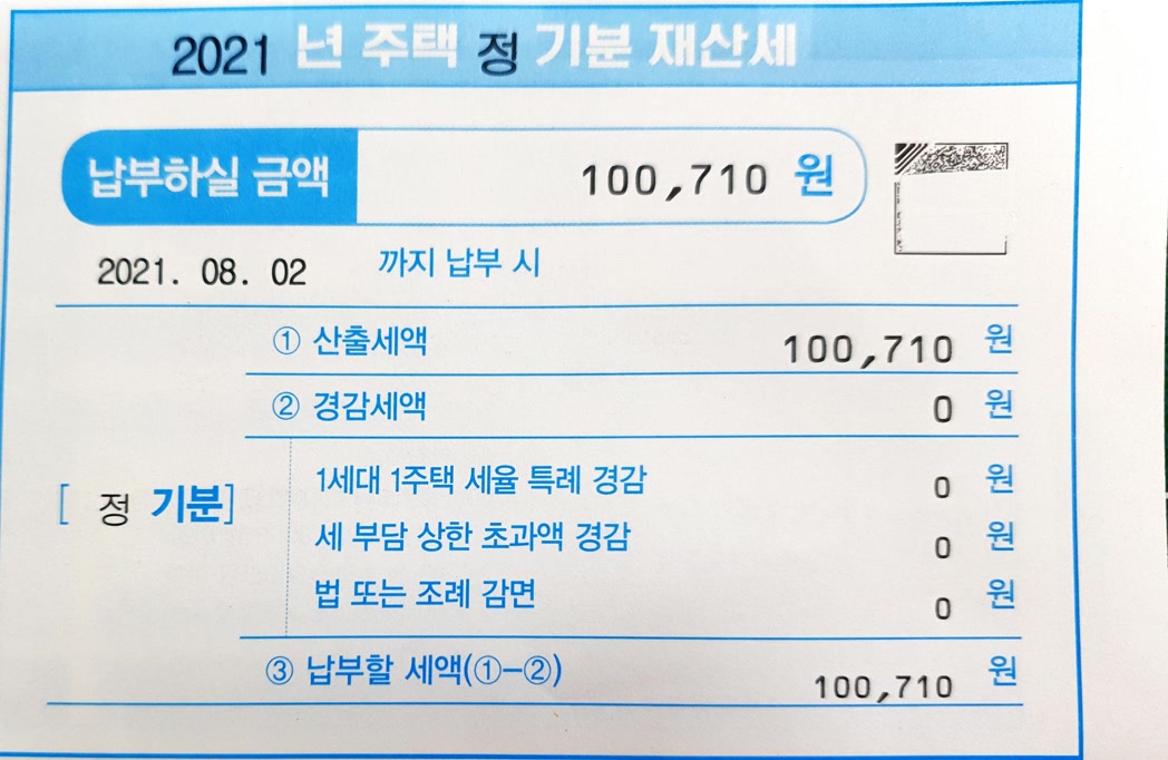 5월 집에 대한 소유를 바꾸었더니 7월 재산세가 나왔습니다. 100,710원.