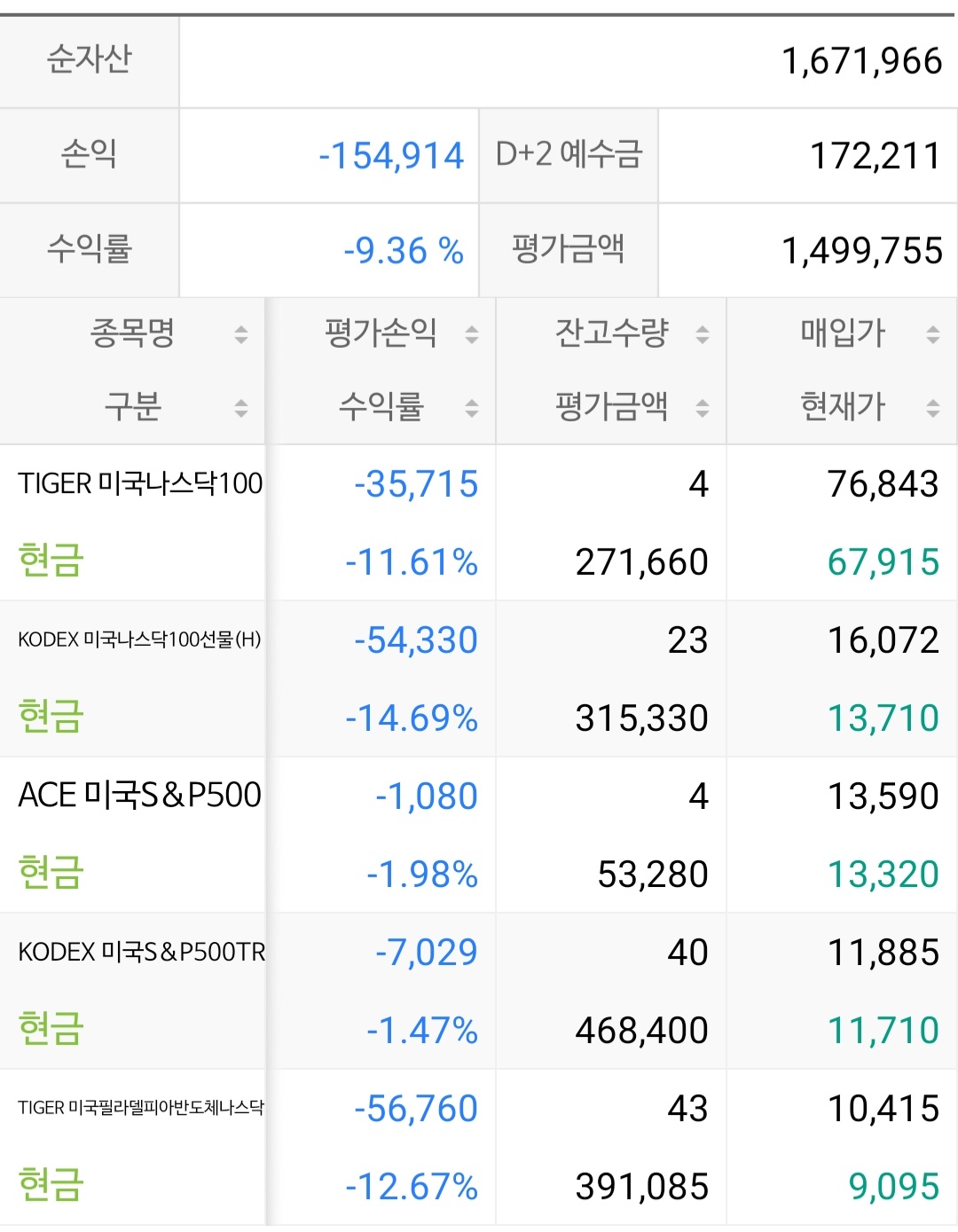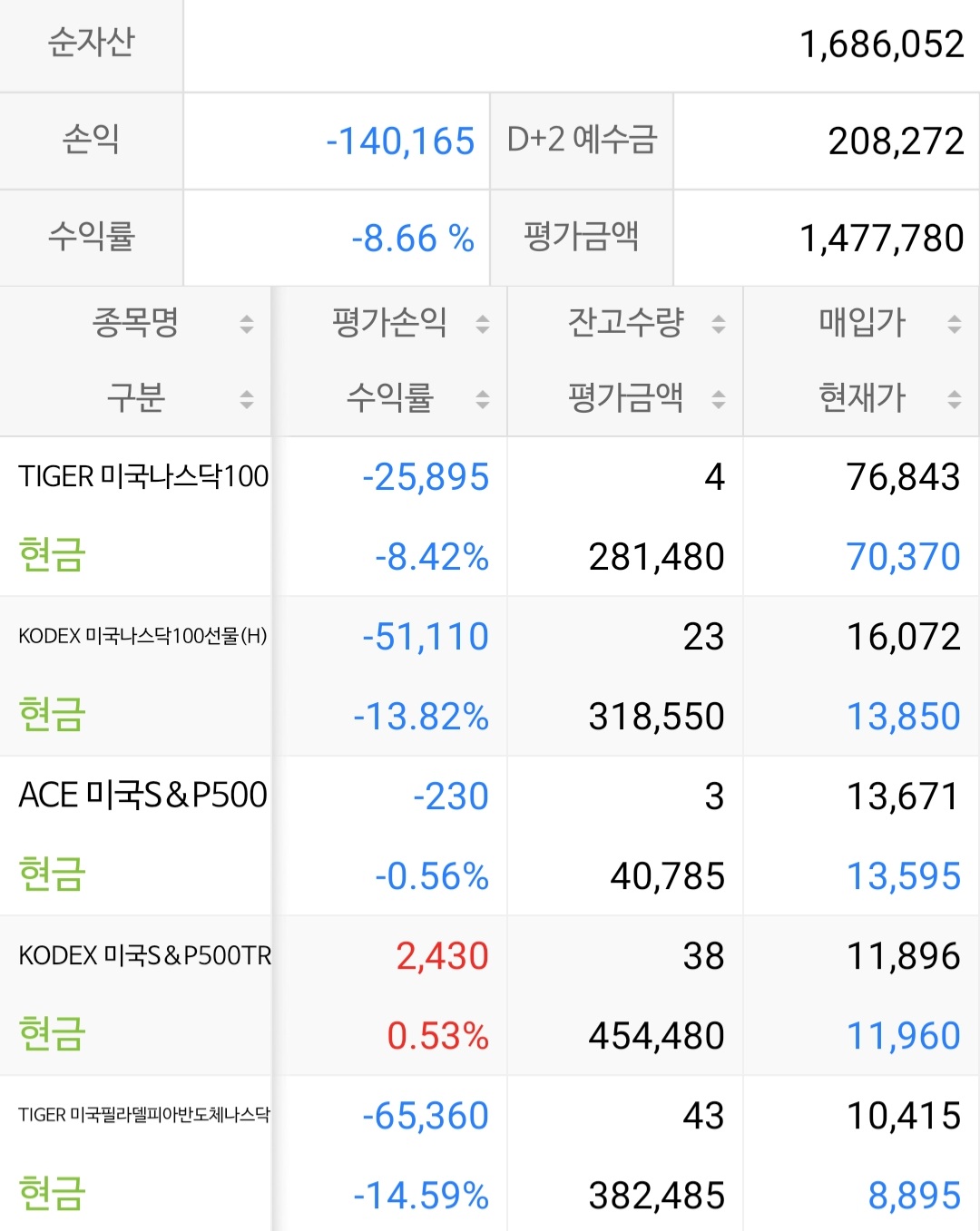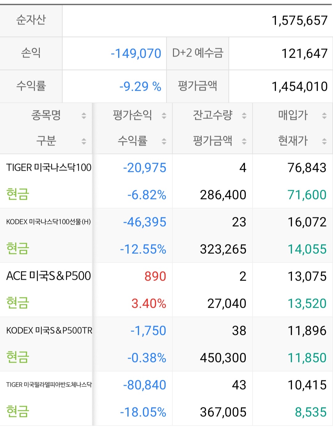 KODEX 미국 S&P500TR은 플러스였는데 며칠 사이에 모두 마이너스가 되었습니다.