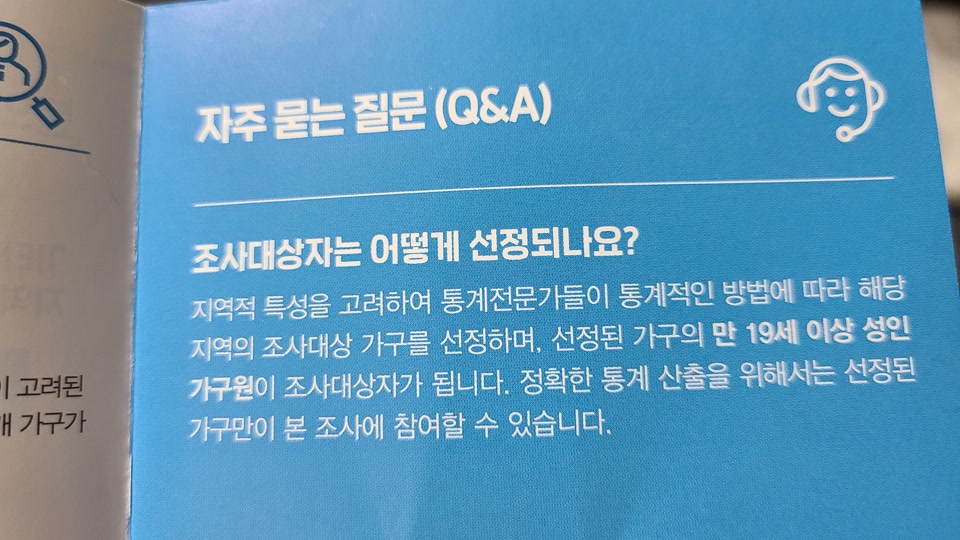 팜플렛을 보니 정확한 통계 산출을 위해서 선정된 가구만이 본 조사에 참여할 수 있다고 하네요.