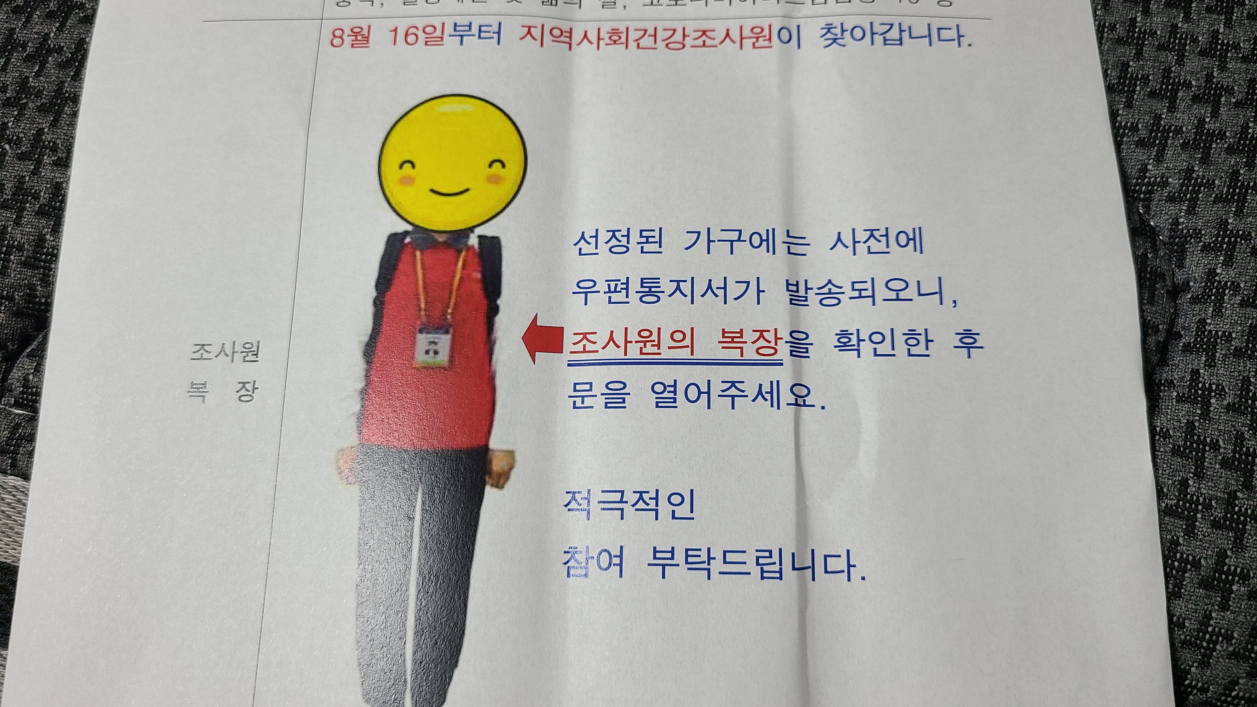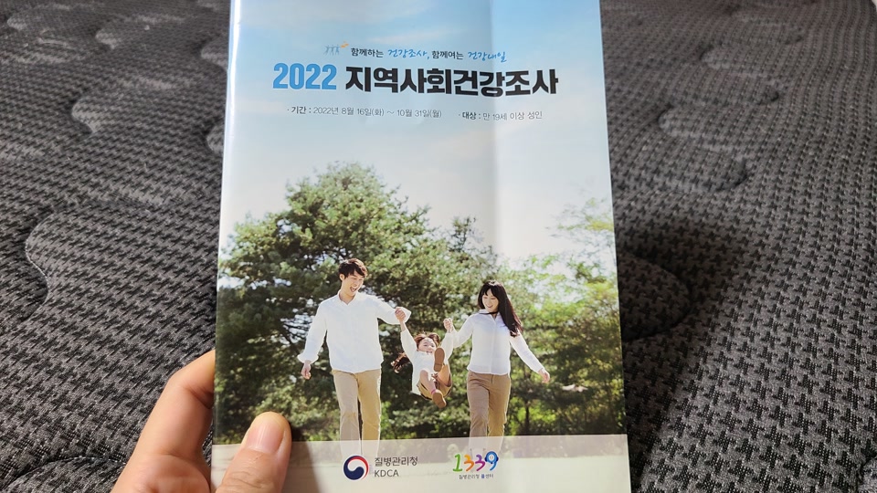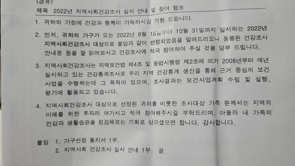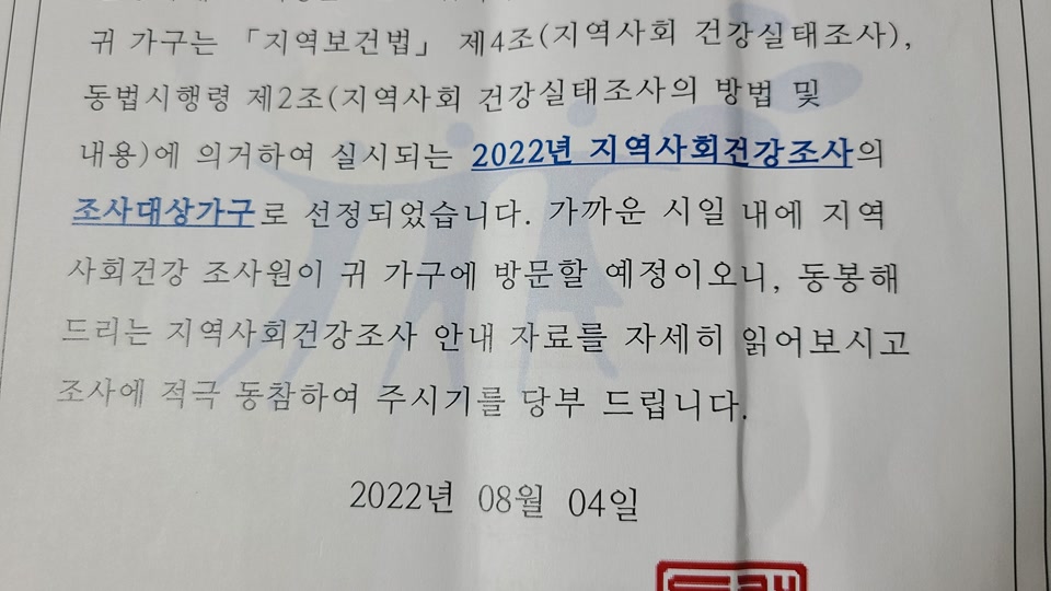 2022년 8월 16일부터 10월 31일까지 실시하는 지역사회건강조사 대상으로 선정이 되었으니 건강조사에 적극 참여를 부탁한다고 하네요.