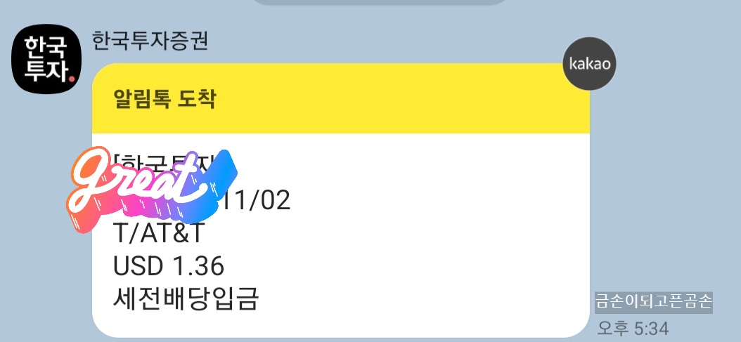 T / AT&T 배당금으로 1.36달러가 나왔습니다. AT&T 주식을 많이 모았는지 배당금이 많이 나왔습니다.