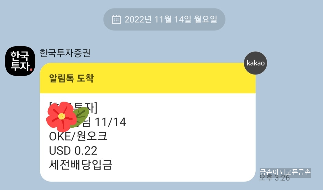 11월 OKE/ 원오크 배당금으로 0.22달러를 받았습니다.
