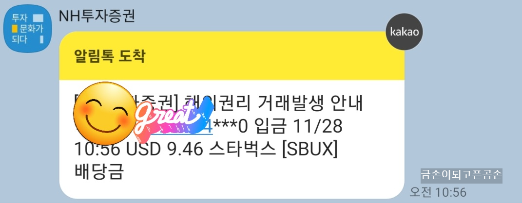 11월 SBUX 스타벅스 배당금 9.46달러가 입금되었습니다.