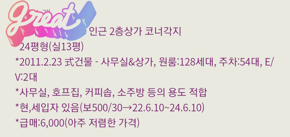 - 사무실, 호프집, 커피솝, 소주방 등의 용도 적합