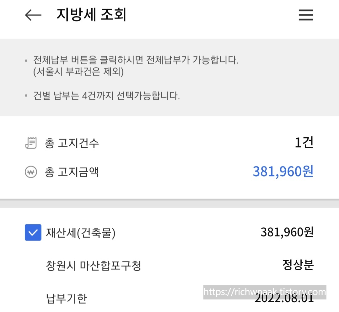 바로 재산세를 내어야합니다. 작년과 마찬가지로 비슷하게 재산세를 내게 되었습니다.