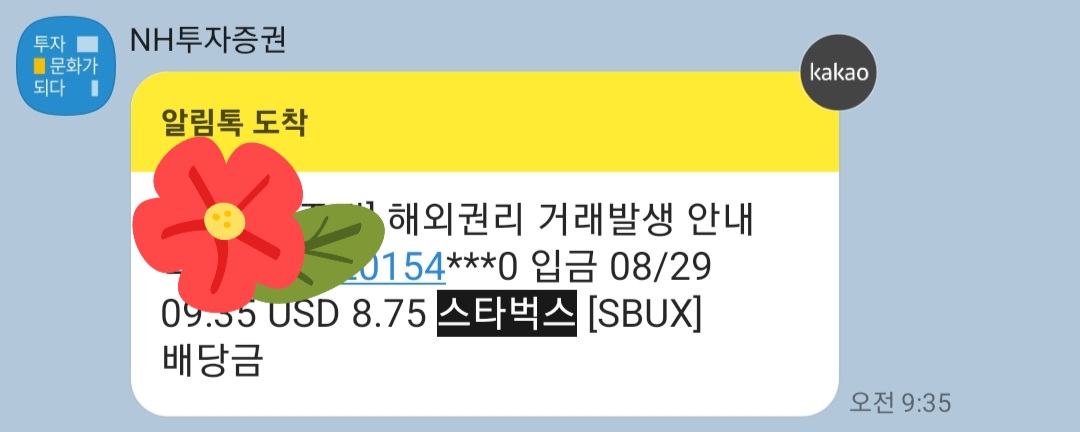 NH투자증권의 스타벅스 주식으로 배당금 8.75달러를 받았어요.