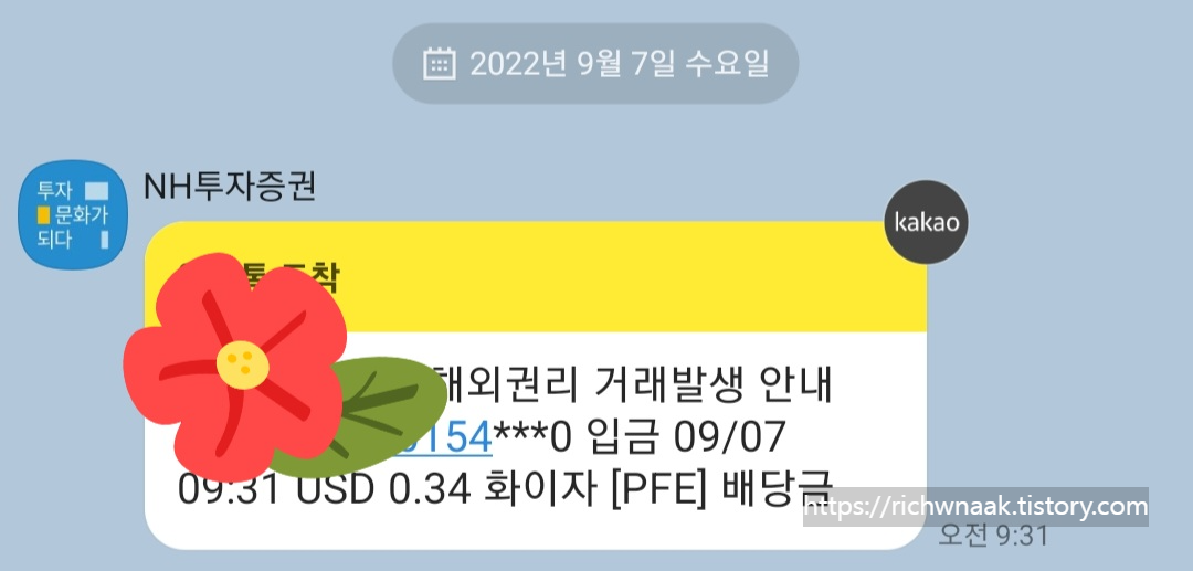 NH투자증권에서 PFE 화이자 배당금을 0.34달러 받았습니다.